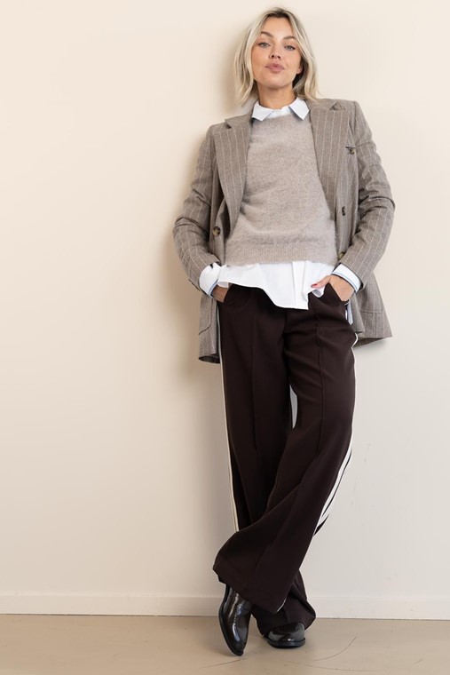 ^ Jasje en truitje zijn koel taupe. De broek is koel donkerbruin. Met lichtere kleuren is het een mooiere combinatie voor een wat lichter kleurtype. Foto van Little Soho.