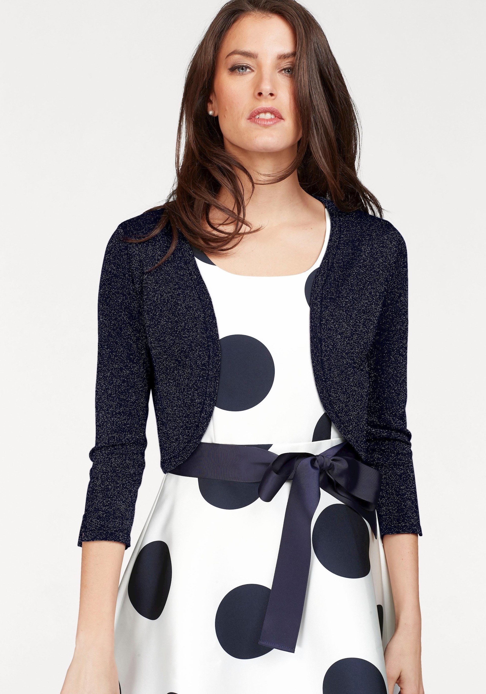 ^ Hier zien we een hele leuke, zomerse bolero van katoen in een fijn ajourmotief. Het bolerootje heeft korte mouwen en een geschulpte rand in haak-look. Het sluit met een bindstrikje. Het bolerootje is te koop bij Otto in vier kleuren: donkerblauw, zwart, wit en taupe.