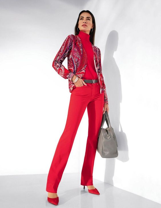 ^ Hier zien we een kort vestje op een lange broek. Deze verhoudingen (1/3 : 2/3) staan vlot. Dit vestje heeft een hele leuke print en maakt de outfit meteen een stuk interessanter. Foto van Madeleine Fashion.