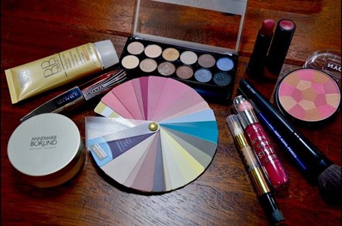 ^ Deze make-up past allemaal uitstekend bij de pocket-kleurenwaaier van het zomer/wintertype.
