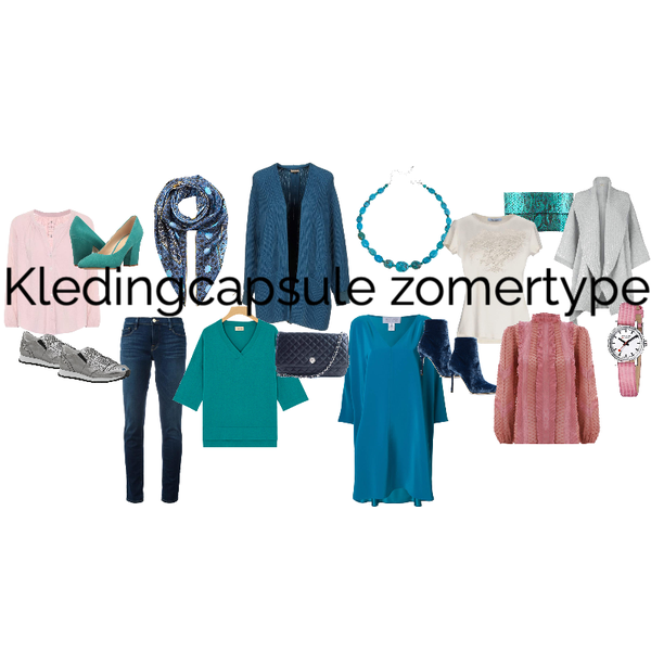 Voor deze capsule heb ik kleuren voor het koele zomertype als uitgangspunt genomen. De neutrale kleuren zijn: grijs, offwhite, jeansblauw en donkerblauw, de opvallender basiskleuren: zijn roze (lichtroze en oudroze), koel groen en helder blauw.