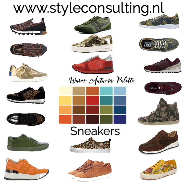 ^ Medium donkere en donkere sneakers hebben de voorkeur voor het warme herfsttype. In bijvoorbeeld zie je allerlei bruintinten, cognackleur, olijfkleur, mosgroen, een warme bordeaux, etc. Maar je kunt ook een basiskleur uit je palet nemen zoals okergeel, oranje, oranjerood, groen, petrol. Je kunt ook op zoek gaan naar sneakers met leuke bronskleurige of mat gouden accentjes. Of met een leuke dierenprint.
